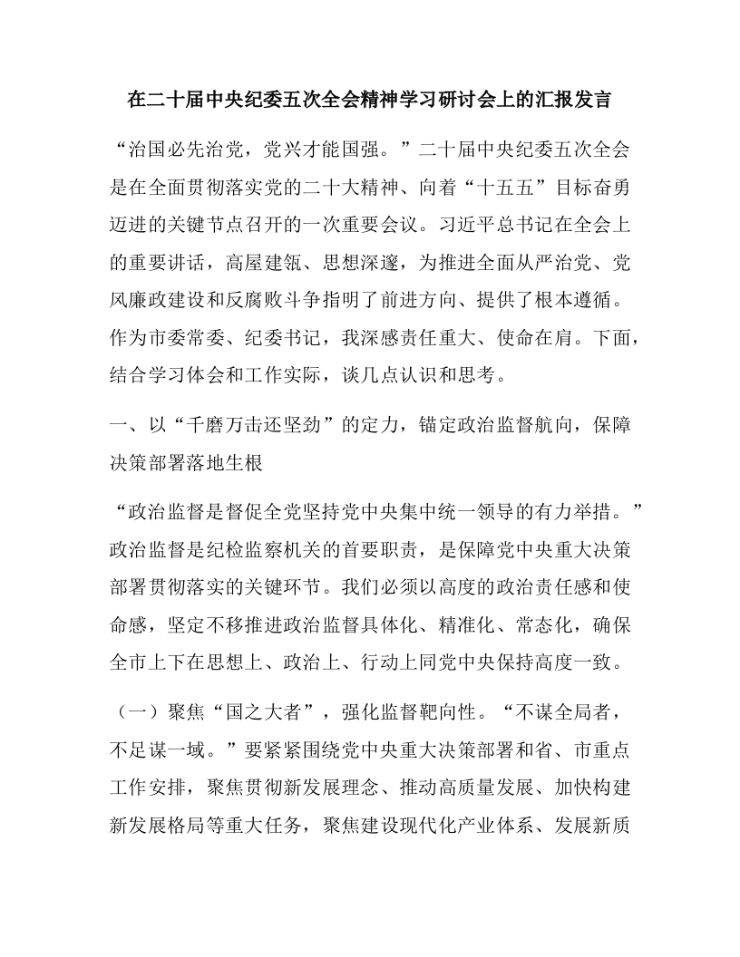 在二十届中央纪委五次全会精神学习研讨会上的汇报发言