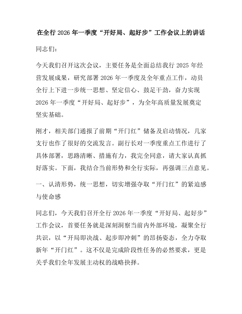在全行2026年一季度“开好局、起好步”工作会议上的讲话
