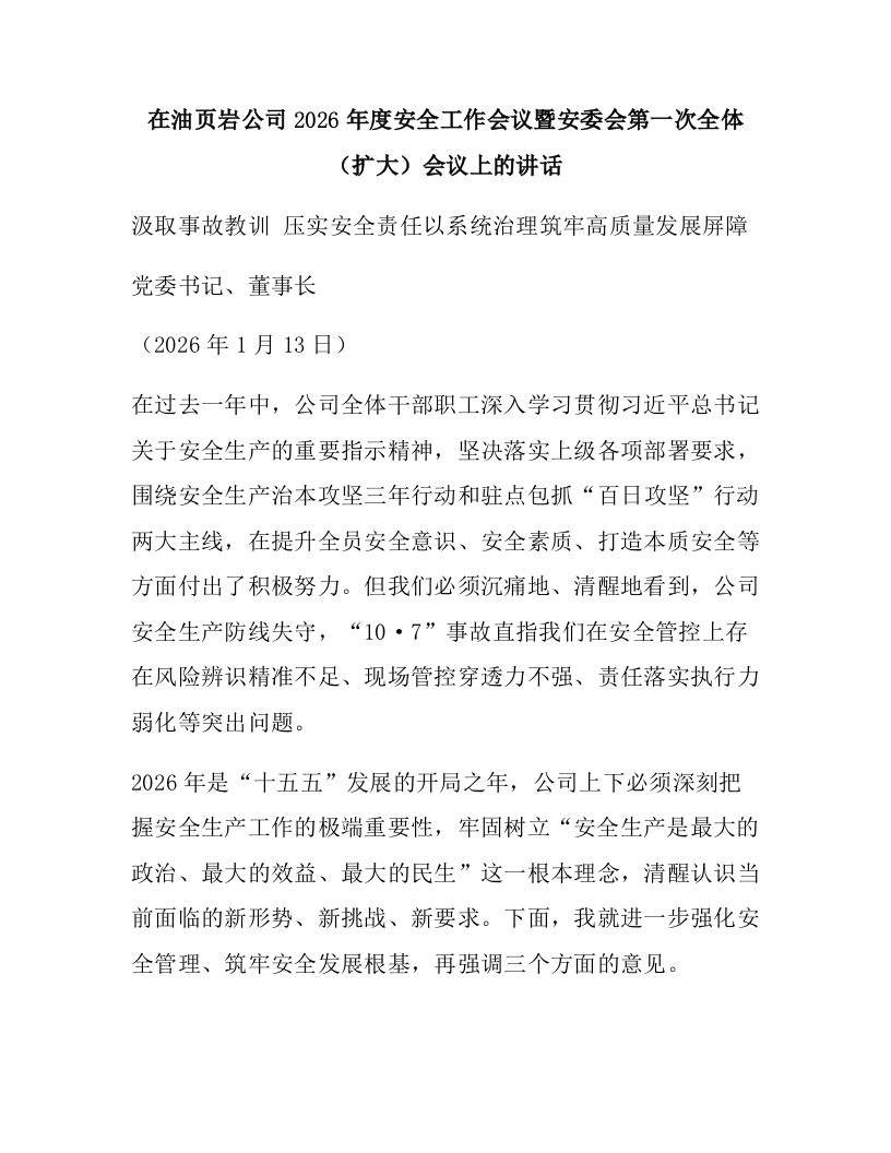 在油页岩公司2026年度安全工作会议暨安委会第一次全体(扩大)会议上的讲话