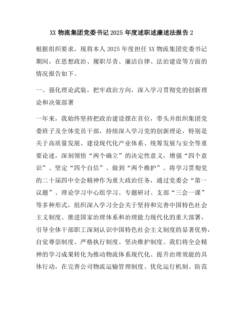 首页报告总结述职述廉XX物流集团党委书记2025年度述职述廉述法报告2