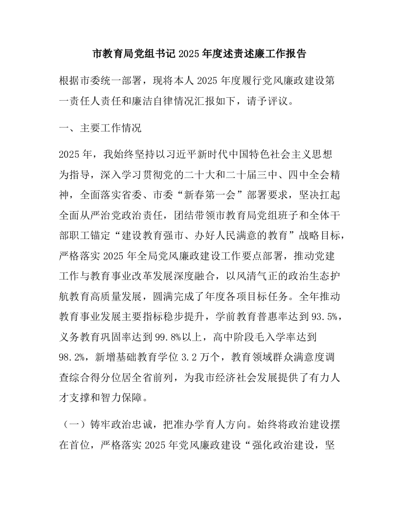 首页报告总结述职述廉市教育局党组书记2025年度述责述廉工作报告