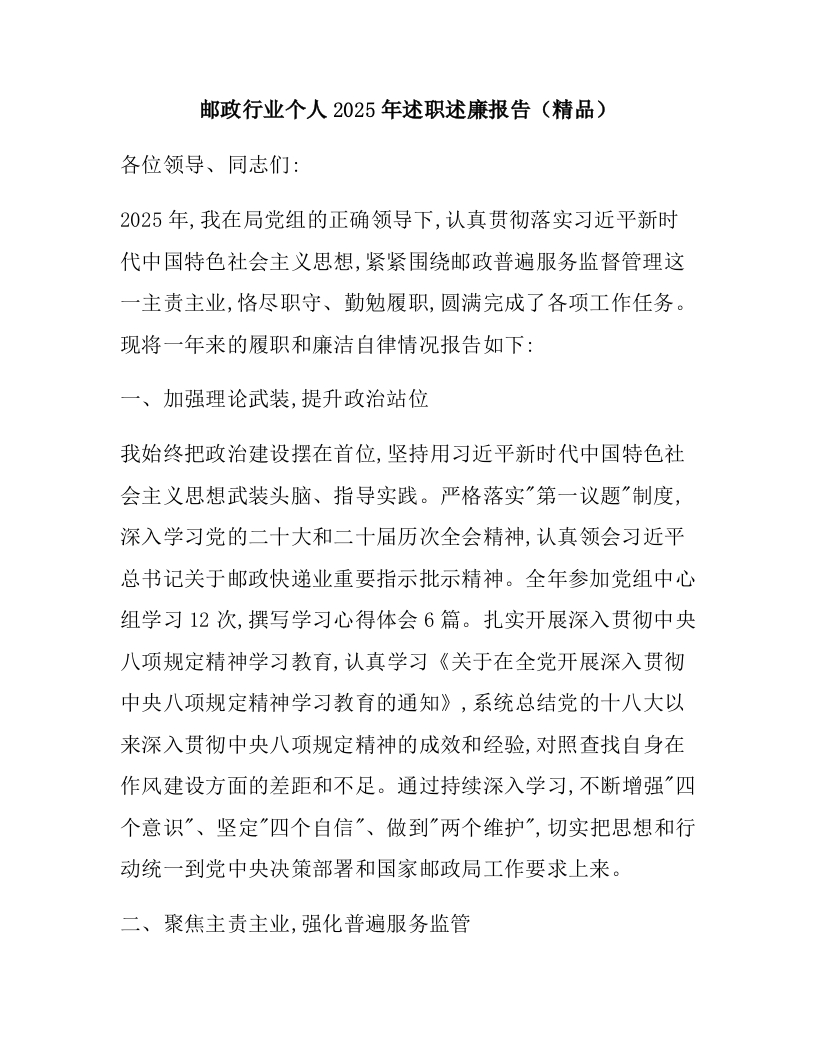 邮政行业个人2025年述职述廉报告(精品)