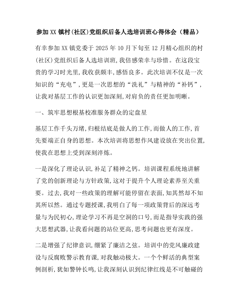 参加XX镇村(社区)党组织后备人选培训班心得体会(精品)