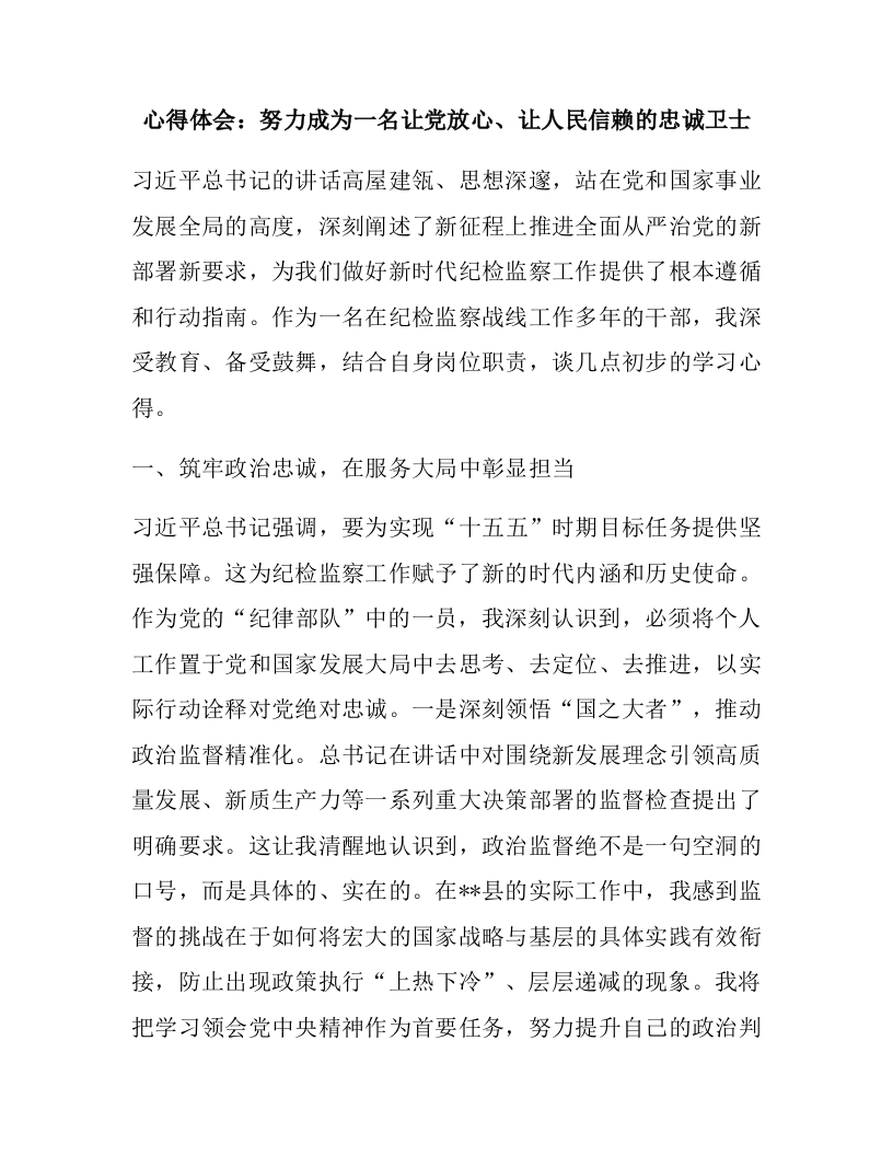 心得体会:努力成为一名让党放心、让人民信赖的忠诚卫士