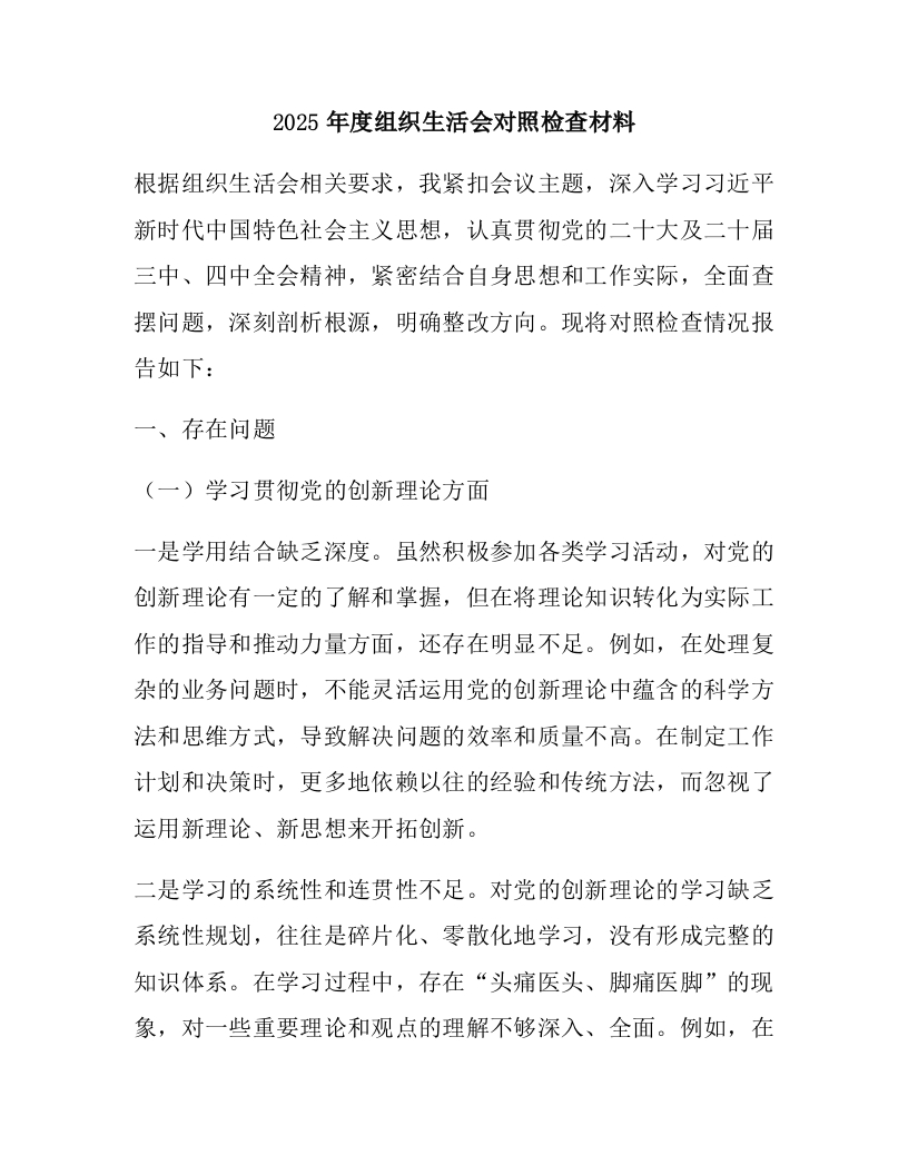 2025年度组织生活会对照检查材料