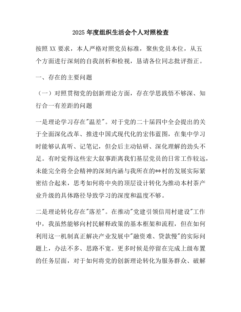 2025年度组织生活会个人对照检查