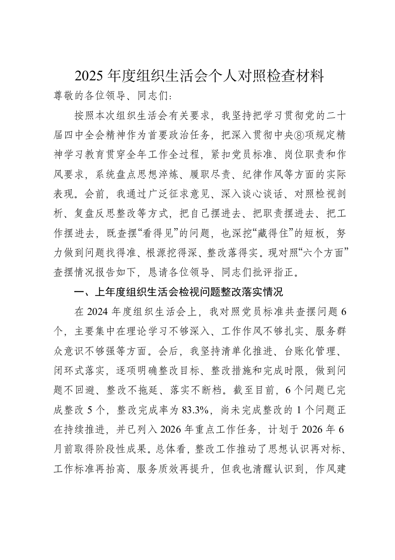 2025年度组织生活会个人对照检查6400字(含民族共同体意识,含上年度整改情况)
