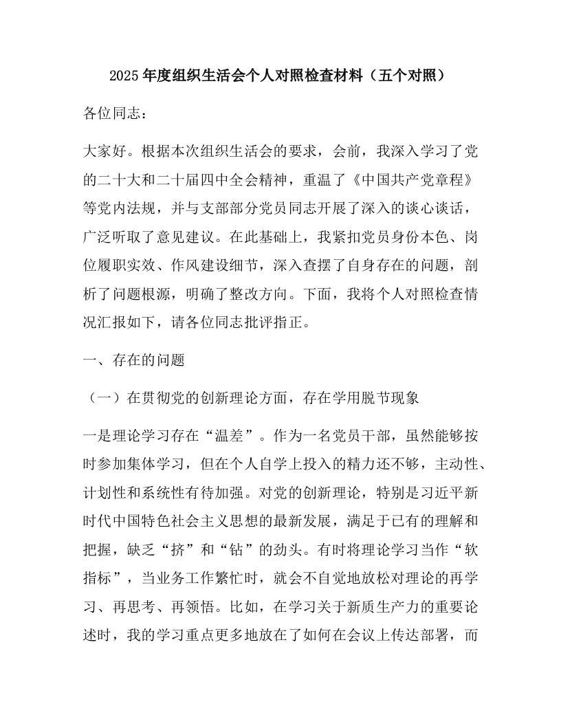 2025年度组织生活会个人对照检查材料(五个对照)