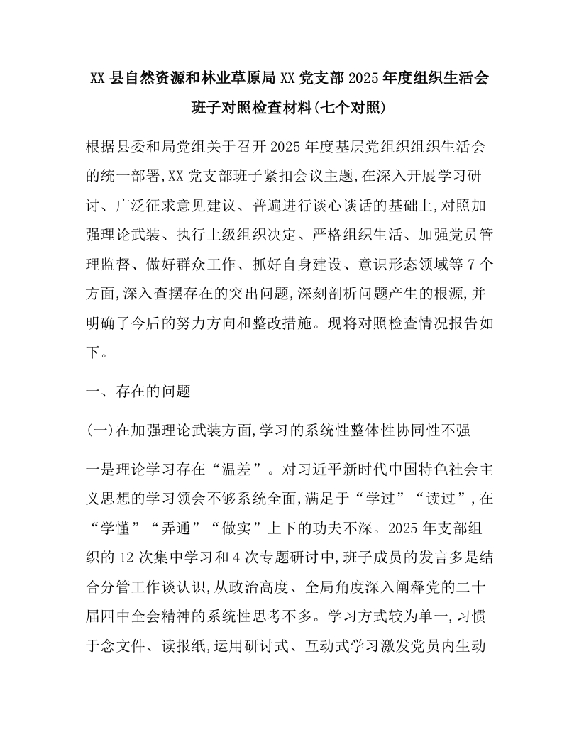 XX县自然资源和林业草原局XX党支部2025年度组织生活会班子对照检查材料(七个对照)