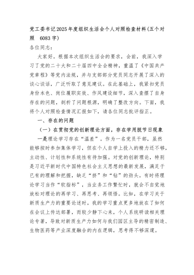 党工委书记2025年度组织生活会个人对照检查材料(五个对照 6083字)