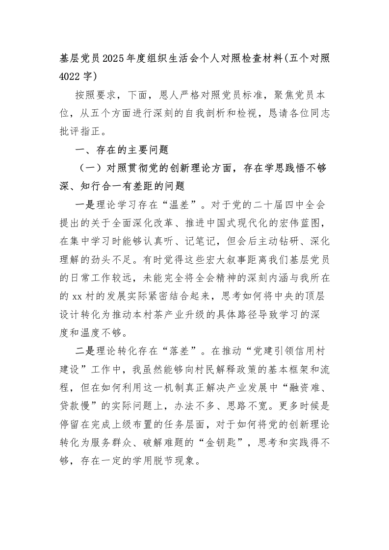 基层党员2025年度组织生活会个人对照检查材料(五个对照 4022字)