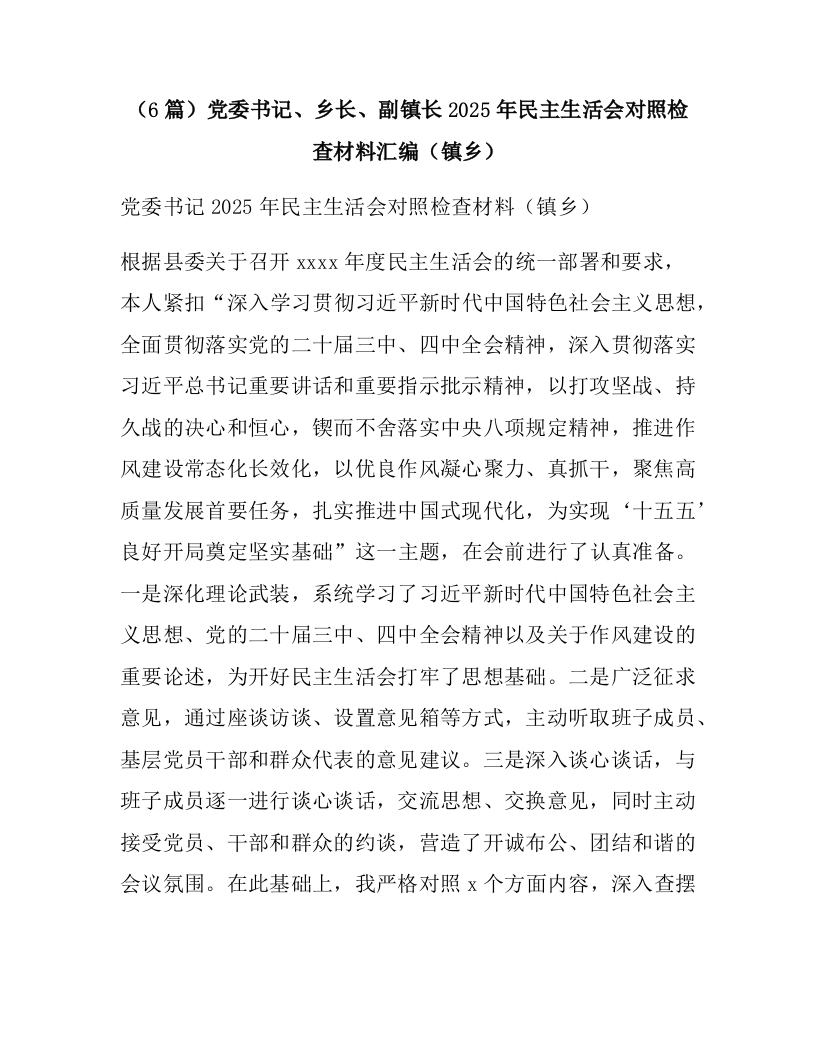 (6篇)党委书记、乡长、副镇长2025年民主生活会对照检查材料汇编(镇乡)