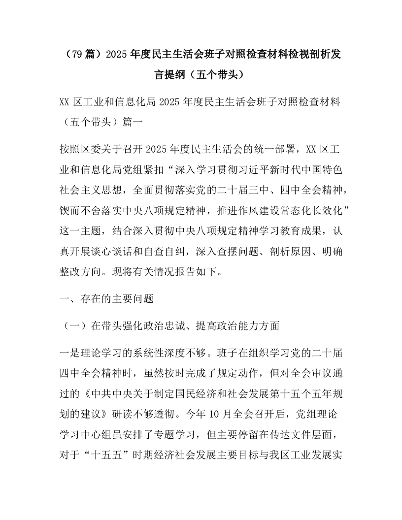 (79篇)2025年度民主生活会班子对照检查材料检视剖析发言提纲(五个带头)