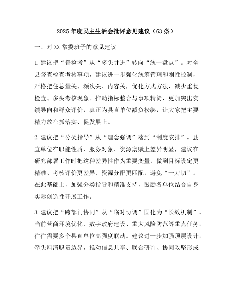 2025年度民主生活会批评意见建议(63条)