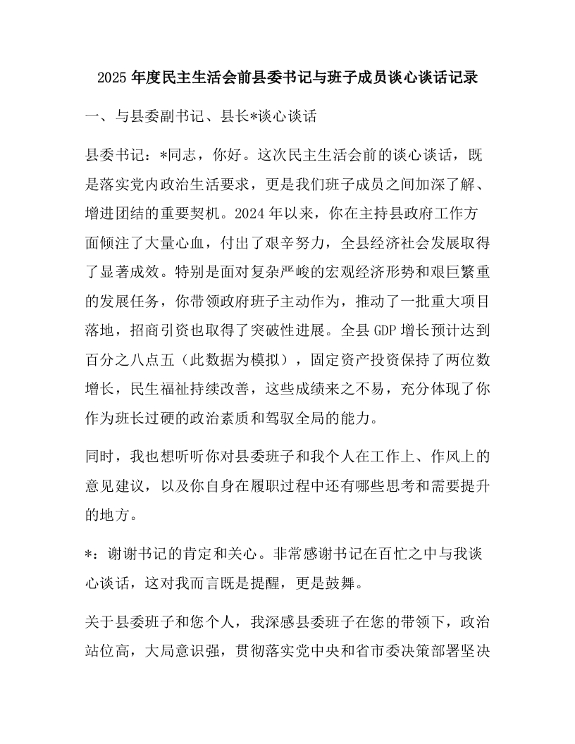 2025年度民主生活会前县委书记与班子成员谈心谈话记录