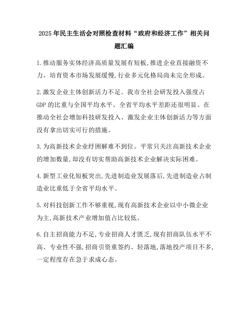 2025年民主生活会对照检查材料“政府和经济工作”相关问题汇编