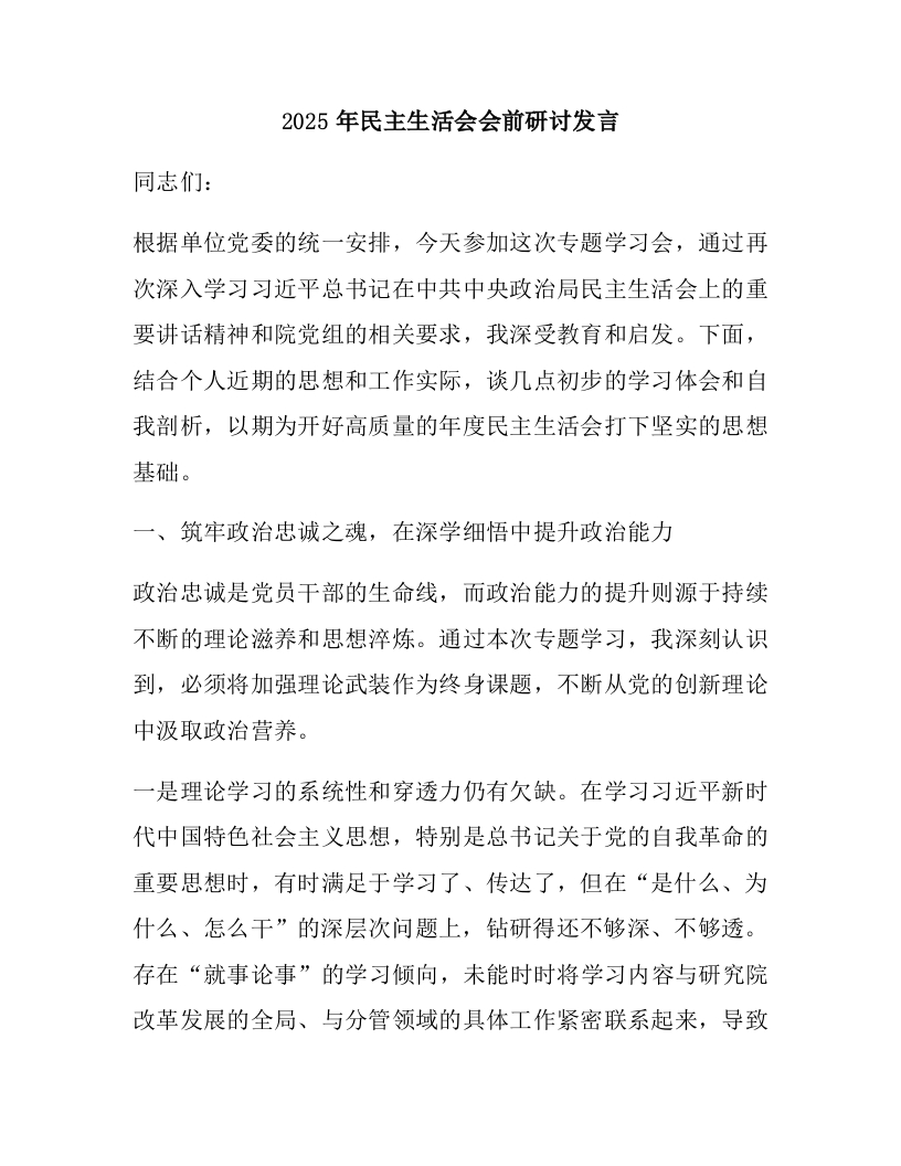 2025年民主生活会会前研讨发言