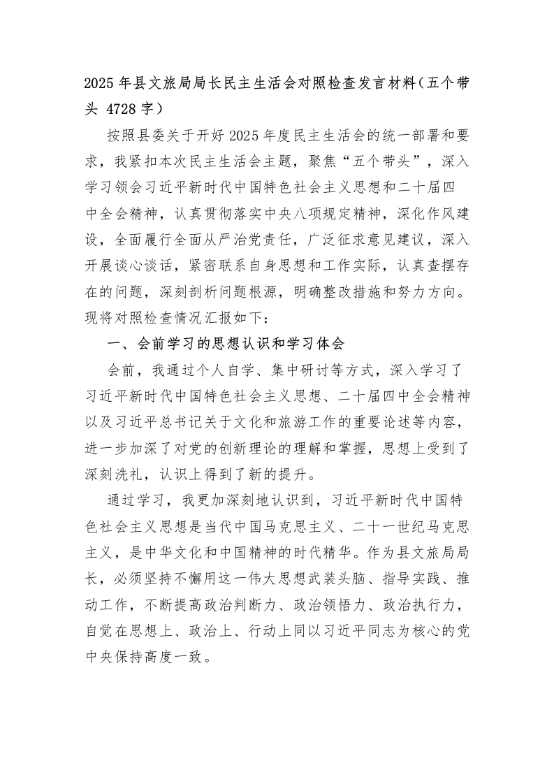 2025年县文旅局局长民主生活会对照检查发言材料(五个带头 4728字)