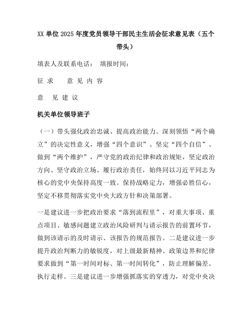 XX单位2025年度党员领导干部民主生活会征求意见表(五个带头)