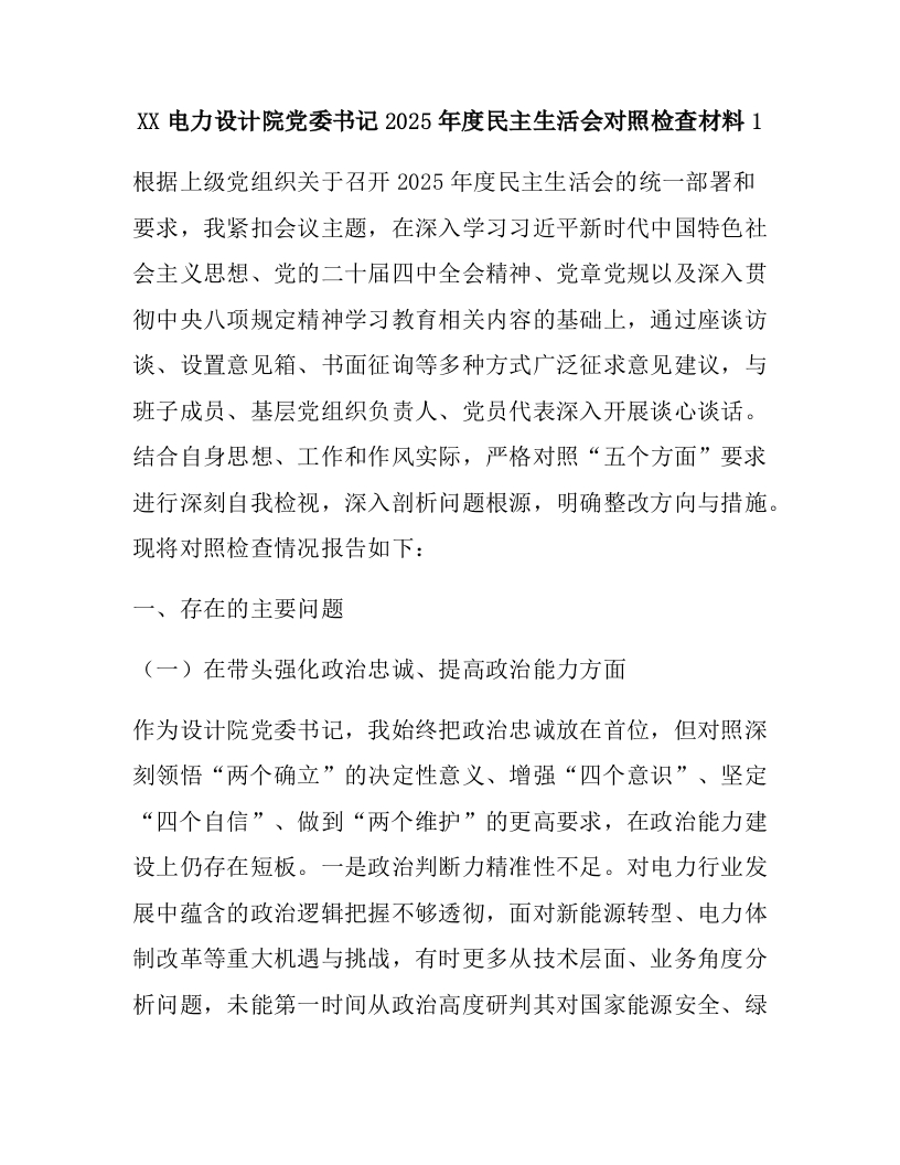 首页热门分类民主生活会XX电力设计院党委书记2025年度民主生活会对照检查材料1