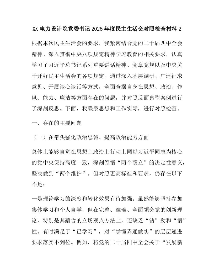 XX电力设计院党委书记2025年度民主生活会对照检查材料2