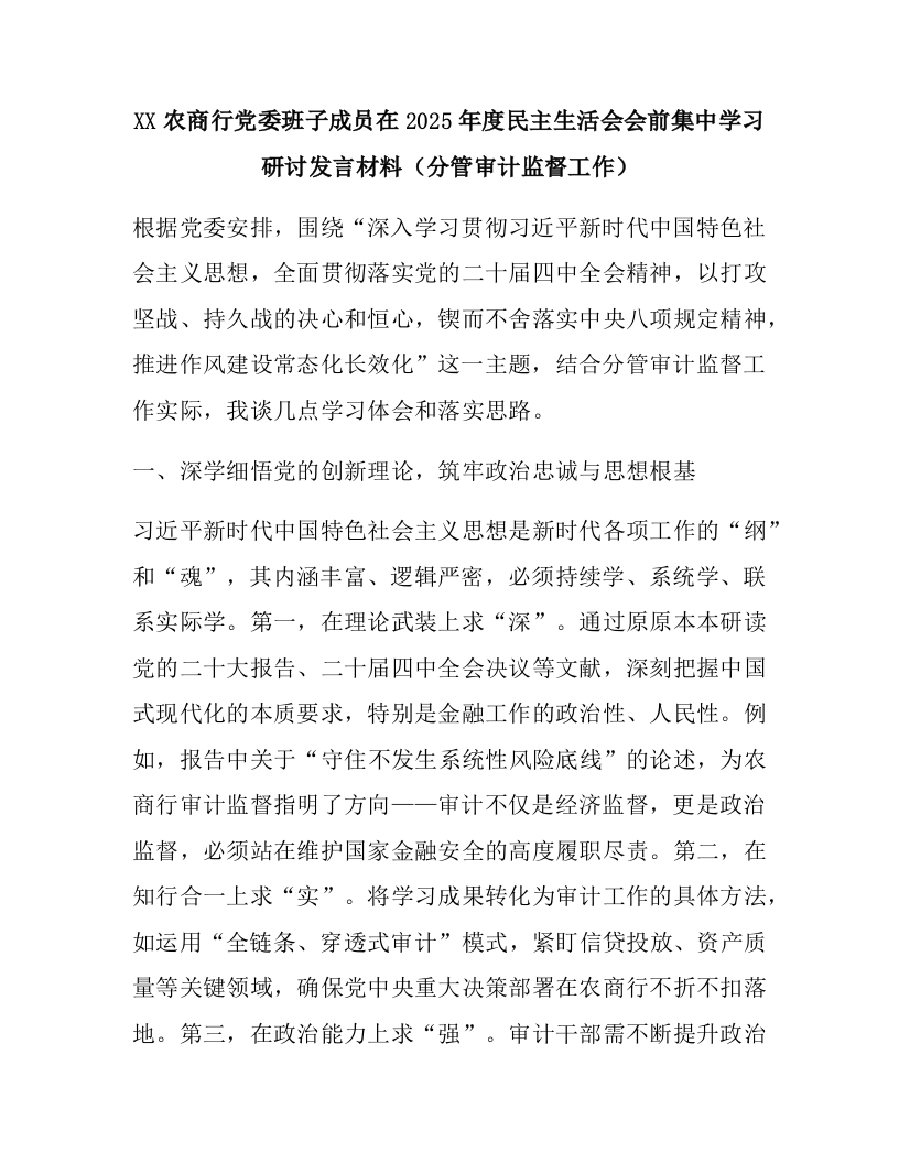 XX农商行党委班子成员在2025年度民主生活会会前集中学习研讨发言材料(分管审计监督工作)
