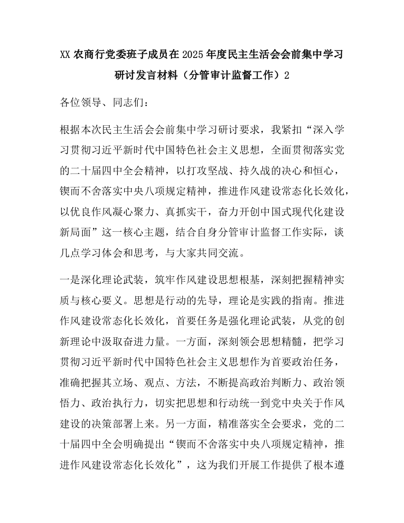 XX农商行党委班子成员在2025年度民主生活会会前集中学习研讨发言材料(分管审计监督工作)2