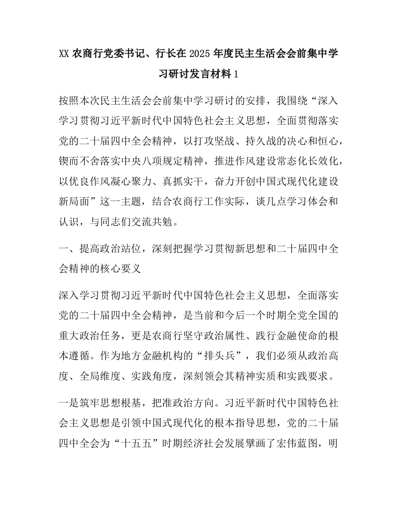 XX农商行党委书记、行长在2025年度民主生活会会前集中学习研讨发言材料1