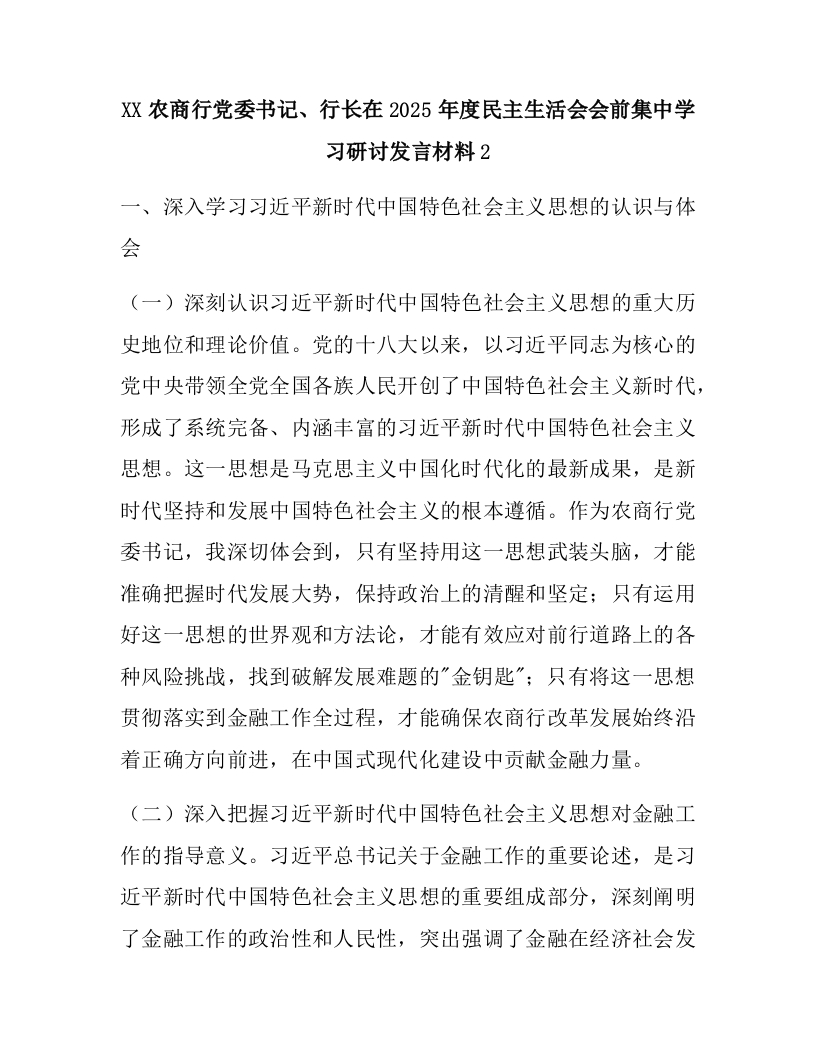 首页热门分类民主生活会XX农商行党委书记、行长在2025年度民主生活会会前集中学习研讨发言材料2