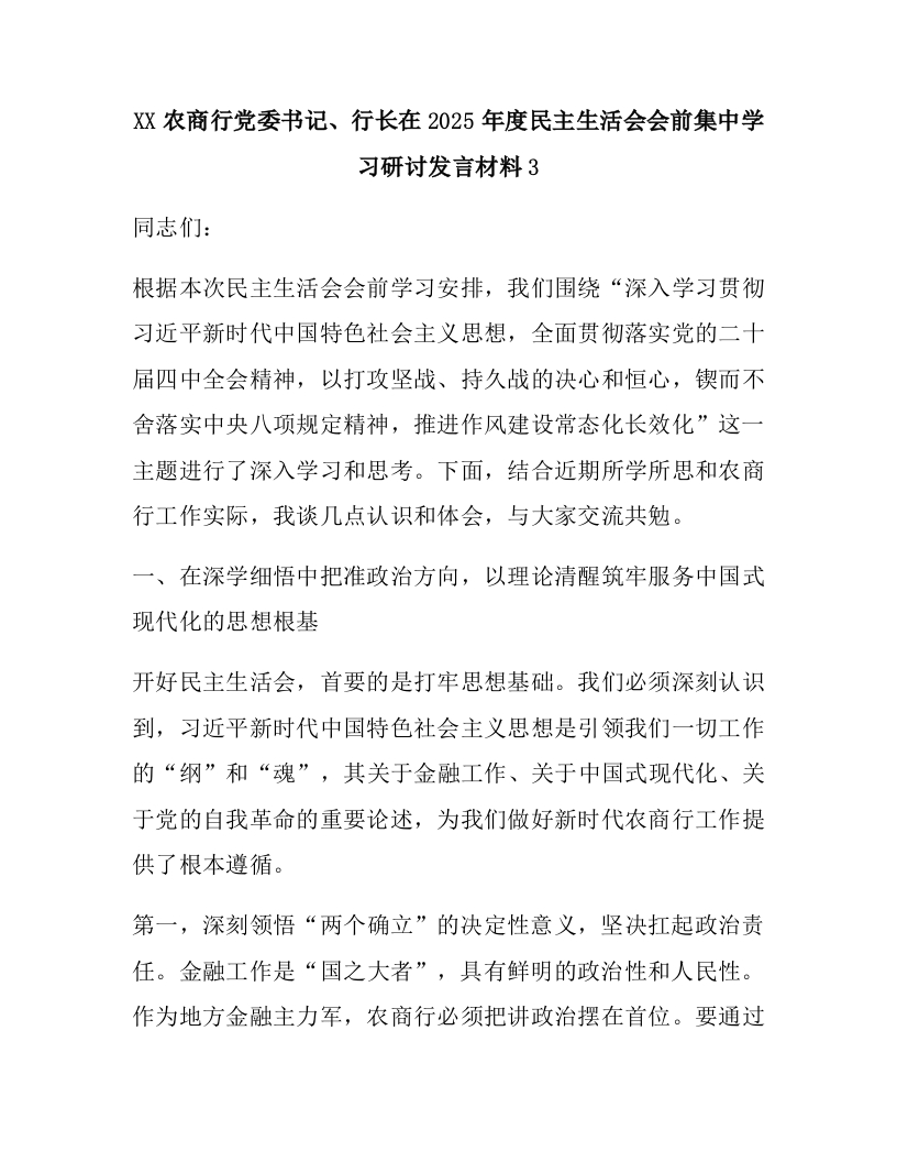 XX农商行党委书记、行长在2025年度民主生活会会前集中学习研讨发言材料3