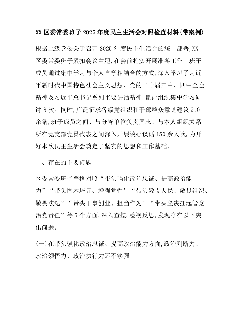XX区委常委班子2025年度民主生活会对照检查材料(带案例)
