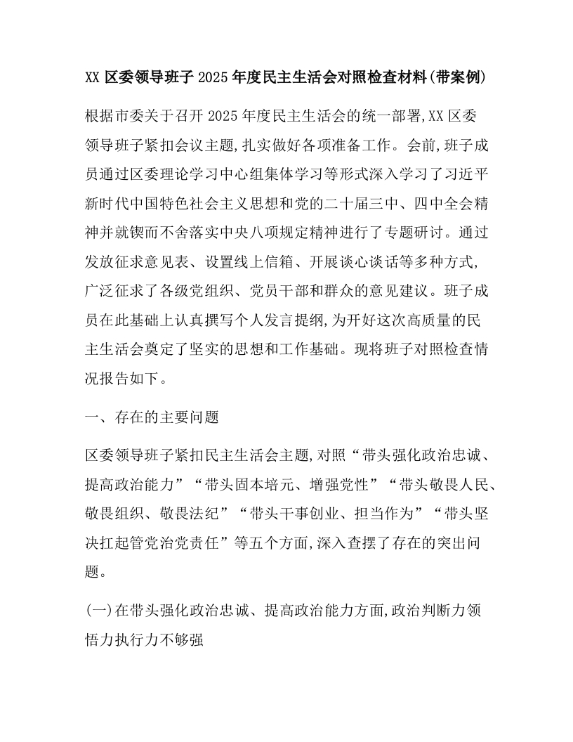 XX区委领导班子2025年度民主生活会对照检查材料(带案例)