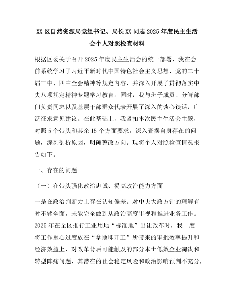 XX区自然资源局党组书记、局长XX同志2025年度民主生活会个人对照检查材料
