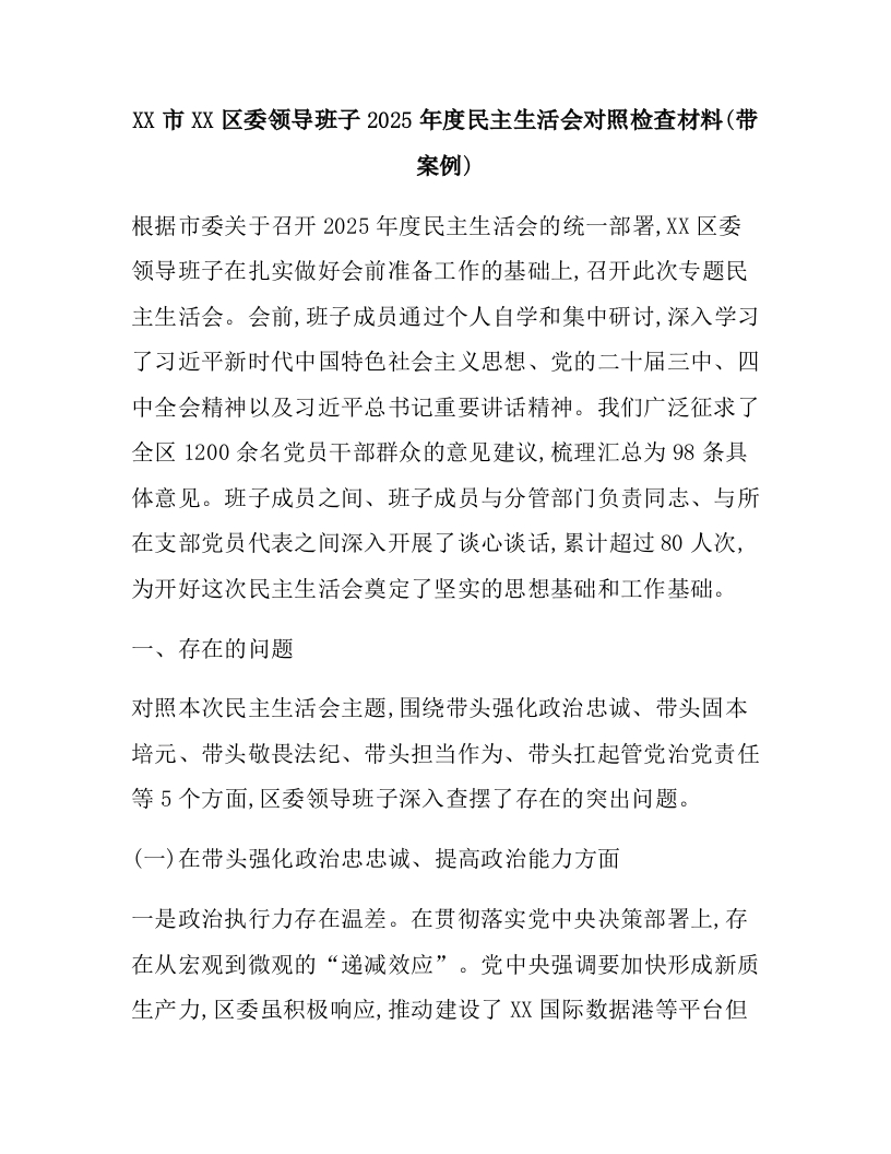 XX市XX区委领导班子2025年度民主生活会对照检查材料(带案例)