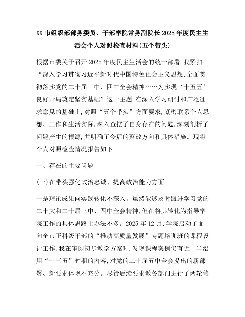 XX市组织部部务委员、干部学院常务副院长2025年度民主生活会个人对照检查材料(五个带头)