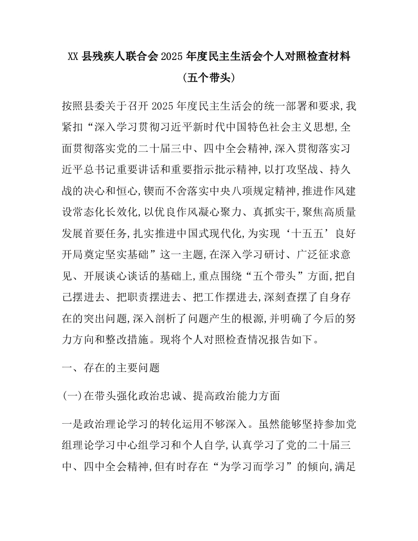 XX县残疾人联合会2025年度民主生活会个人对照检查材料(五个带头)