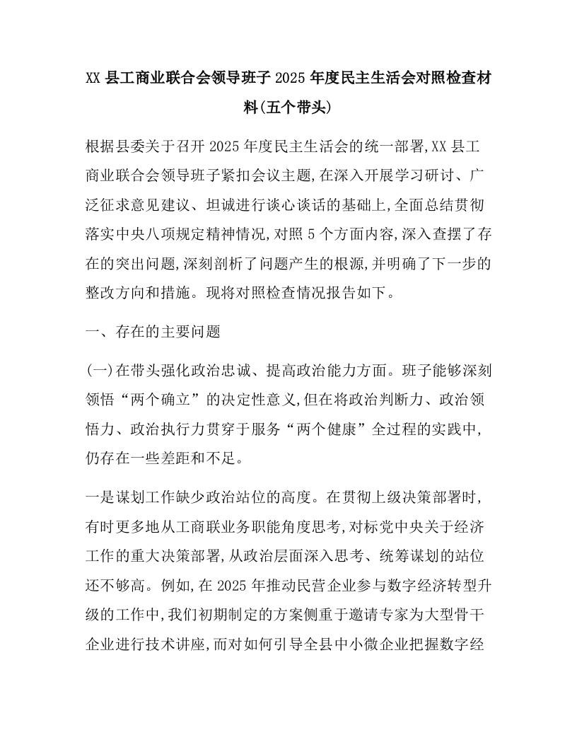 XX县工商业联合会领导班子2025年度民主生活会对照检查材料(五个带头)