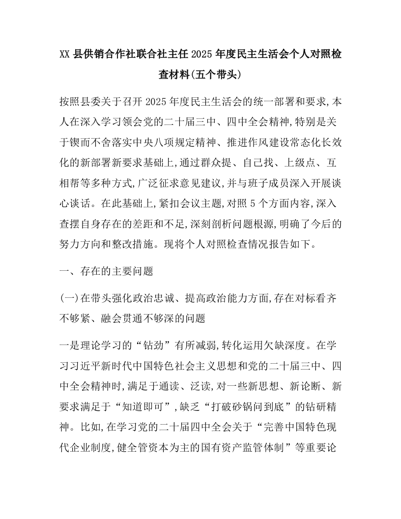 首页热门分类民主生活会XX县供销合作社联合社主任2025年度民主生活会个人对照检查材料(五个带头)