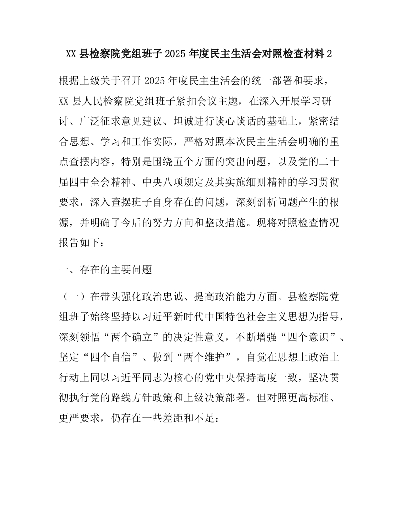 首页热门分类民主生活会XX县检察院党组班子2025年度民主生活会对照检查材料2