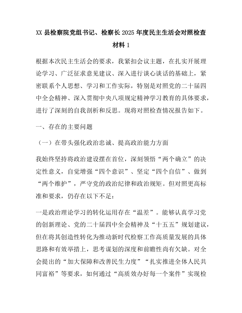 XX县检察院党组书记、检察长2025年度民主生活会对照检查材料1