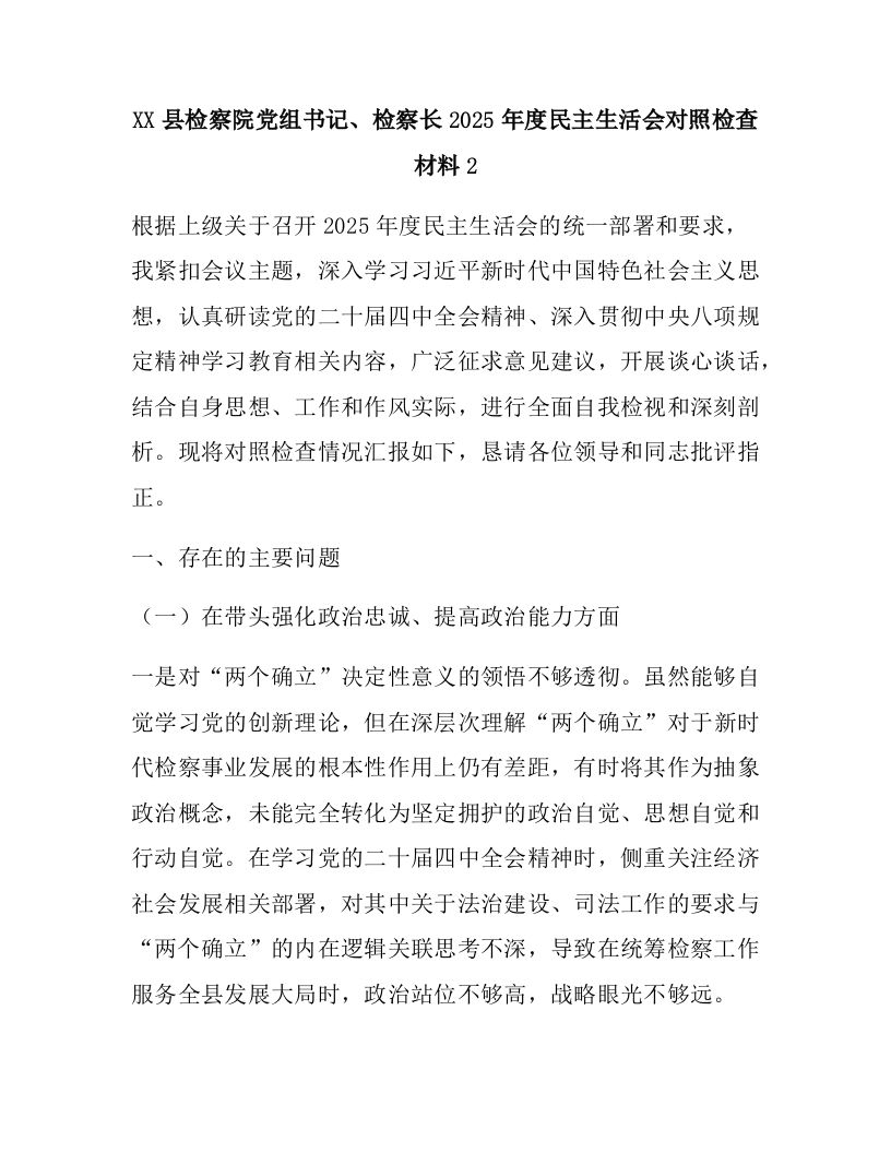 XX县检察院党组书记、检察长2025年度民主生活会对照检查材料2