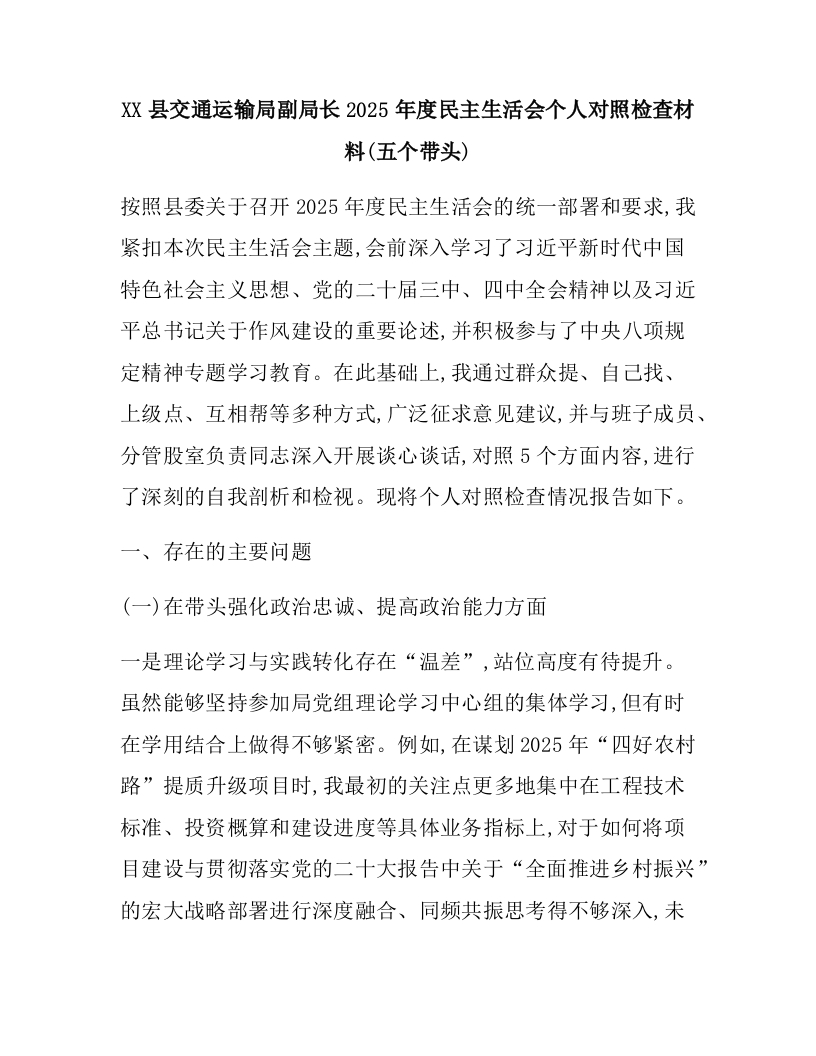 XX县交通运输局副局长2025年度民主生活会个人对照检查材料(五个带头)