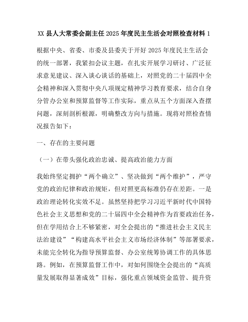 XX县人大常委会副主任2025年度民主生活会对照检查材料1